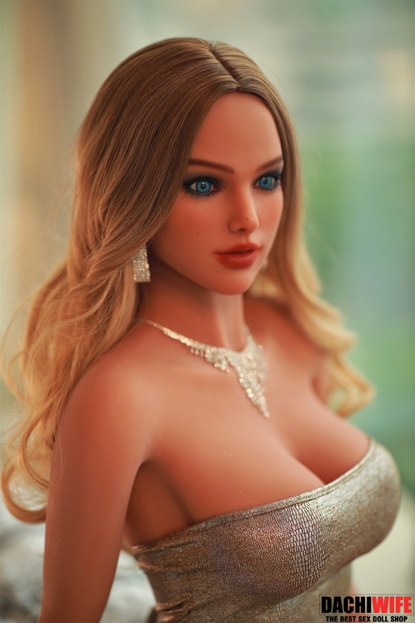 This blonde sex doll looks like a celebrity who just finished a dinner party. She is wearing a short golden evening dress that will fall down with a slight tug, revealing her lovely breasts.